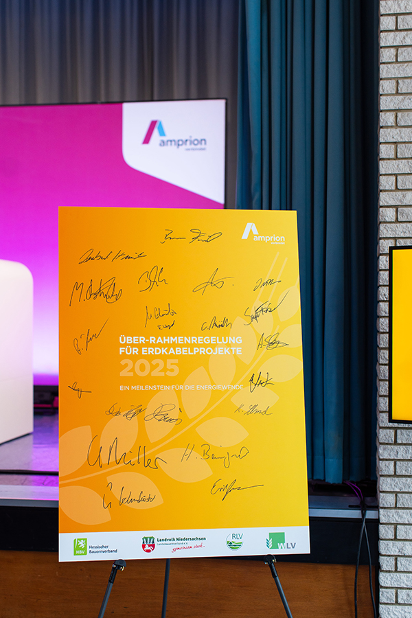 | | Ein großer Meilenstein für den Rhein-Main-Link: Landwirtschaftsverbände aus Niedersachsen, Nordrhein-Westfalen und Hessen haben sich mit der Amprion auf eine gemeinsame Rahmenregelung für die Vereinbarung von Leitungsrechten für Erdkabeltrassen geeinigt. Erstmalig liegt damit eine projektübergreifende Vereinbarung vor, die alle Bundesländer, die der Rhein-Main-Link durchläuft, umfasst. Die Vereinbarung gibt einen Rahmen für die anstehenden Gespräche und Verhandlungen der Leitungsrechte mit den Eigentümer*innen und Pächter*innen vor. Weitere Informationen zur Unterzeichnung finden Sie in unserer Pressemitteilung. | |