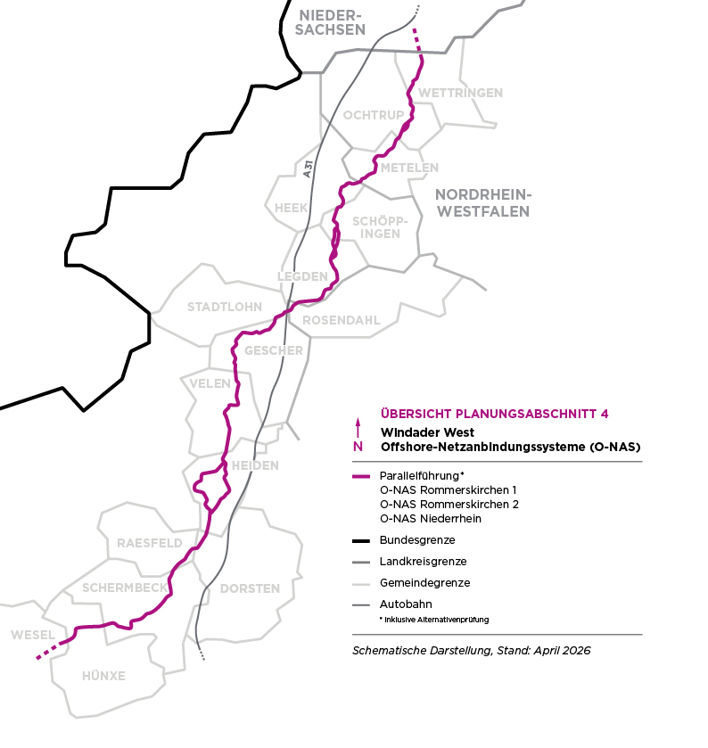 Ende April sind wir mit der Windader West wieder vor Ort – diesmal im Planungsabschnitt 4 in Nordrhein-Westfalen. Der Abschnitt reicht von der Landesgrenze Niedersachsen/NRW bis nach Wesel. Bei unseren Infoterminen stellen wir Ihnen erstmals unsere erste Trassenplanung für diesen Bereich vor. Außerdem informieren wir über die anstehenden Baugrunduntersuchungen und wie die weiteren Schritte im Planungsprozess aussehen. Kommen Sie gerne vorbei und nutzen Sie die Gelegenheit, Ihre Fragen und Anregungen direkt mit uns zu besprechen. Die genauen Termine und Veranstaltungsorte finden Sie im weiteren Verlauf dieses Newsletters sowie auf unserer Projektwebseite. Die Bürgerinfomärkte haben keinen Vortragsteil, Sie können also jederzeit kommen und gehen. Die Kolleg*innen stehen Ihnen an verschiedenen Themeninseln für Informationen und Fragen zur Verfügung. Montag, 27.04.2026 27.04.2026, 10-12 Uhr, Heek Werkhalle Maakwi Campus Gleisweg 12, 48619 Heek 27.04.2026, 14-16 Uhr, Ochtrup Foyer der Stadthalle Ochtrup Gronauer Str. 1, 48607 Ochtrup 27.04.2026, 17-19 Uhr, Metelen Bürgerhaus Metelen Sendplatz 14a, 48629 Metelen Dienstag, 28.04.2026 28.04.2026, 10-12 Uhr, Legden Event-Location Dorf Münsterland Haidkamp 1, 48739 Legden 28.04.2026, 14-16 Uhr, Gescher Hotel Tenbrock Hauskampstraße 12-14, 48712 Gescher 28.04.2026, 17-19 Uhr, Velen Burgsaal Burgplatz 4, 46342 Velen-Ramsdorf Mittwoch, 29.04.2026 29.04.2026, 10-12 Uhr, Heiden Forum im Haus der Begegnung Velener Str. 29, 46359 Heiden 29.04.2026, 14-16 Uhr, Hünxe Schützenhaus des Schützenverein Drevenack e.V. Buschweg 8, 46569 Hünxe-Drevenack 29.04.2026, 17-19 Uhr, Schermbeck Ramirez Gastronomie Maassenstraße 84, 46514 Schermbeck Donnerstag, 30.04.2026 30.04.2026, 10-12 Uhr, Raesfeld HUB Erle Silvesterstraße 2, 46348 Raesfeld |